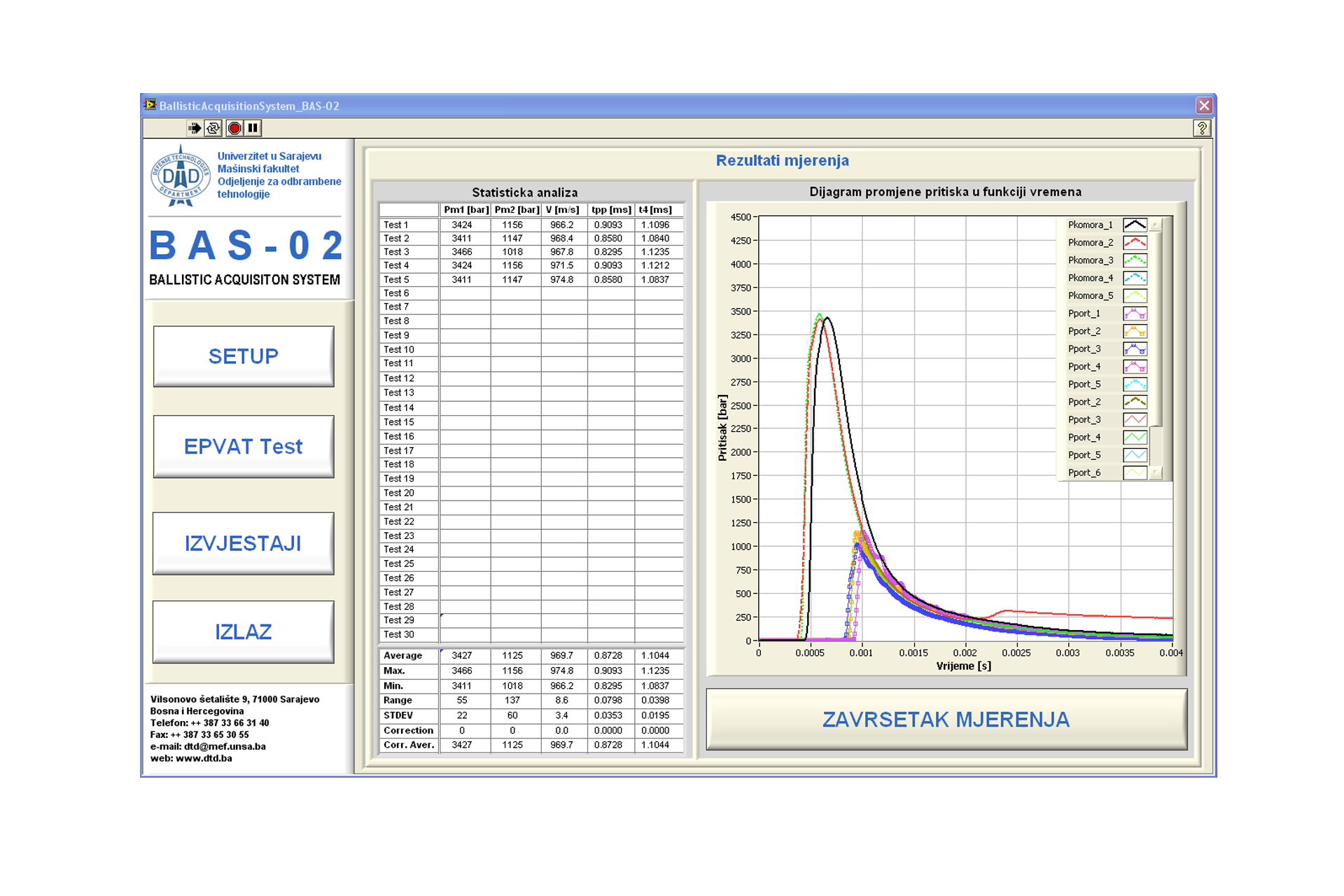 Za potrebe fabrika POBJEDA-SPORT Goražde i IGMAN Konjic, Katedra je dizajnirala balistički akvizicijski sistem za mjerenje pritiska gasova u komori sagorijevanja municije, pritisak na povratniku gasova, mjerenje brzine projektila i karakterističnih vremena za municiju malog kalibra. Za opremu je razvijen softver u programskom paketu LabVIEW, koji omogućava mjerenje zadatih parametara i statističku obradu rezultata mjerenja, a rezultate analize zapisuje u izvještaj, u skladu sa tipom municije i standardom.