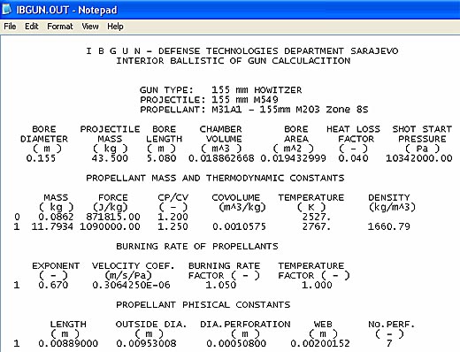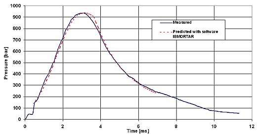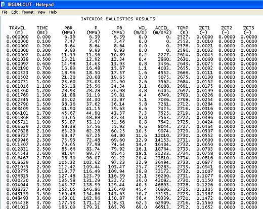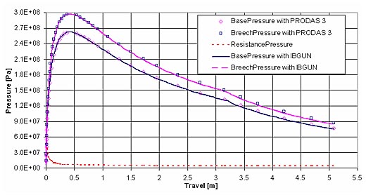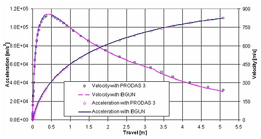 The Interior Ballistics analysis calculates the velocity, breech and base pressure, accelerations of the projectile during travel down the barrel, using model STANAG 4367, Edition 2, Termodynamic Inetrior Balistic Model with Global Parameter